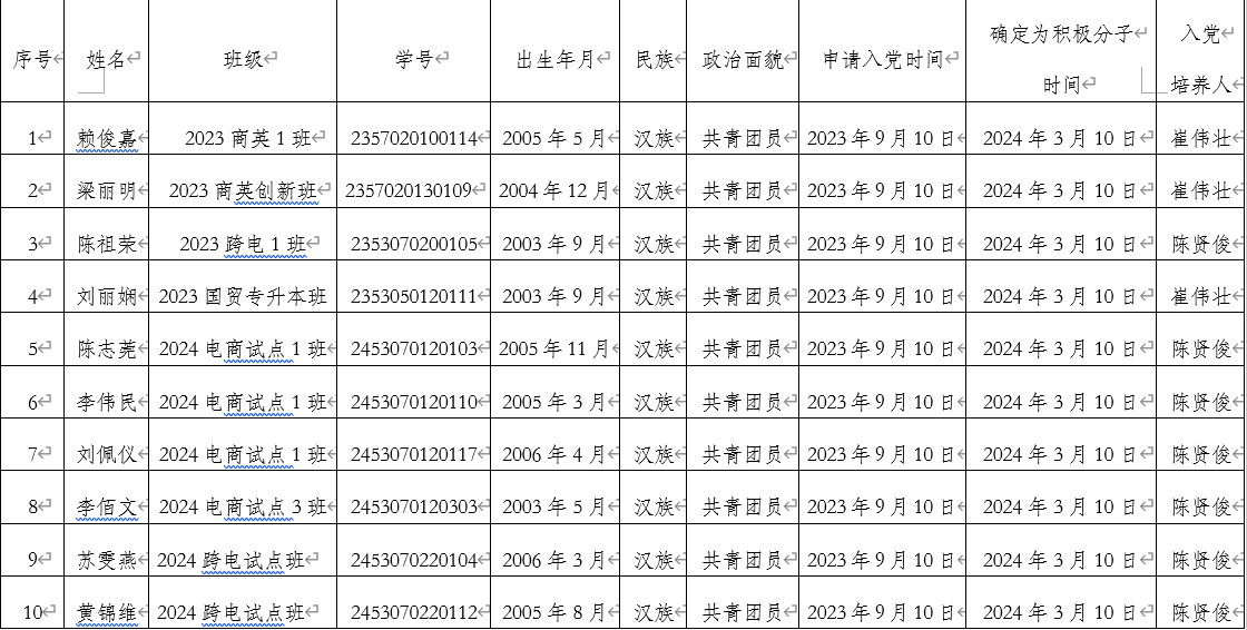 经数字商贸学院学生第二党支部培养、考察、教育和预审,支部委员会研究决定,拟确定赖俊嘉等10位同志为党员发展对象,现予以公示。名单如下: