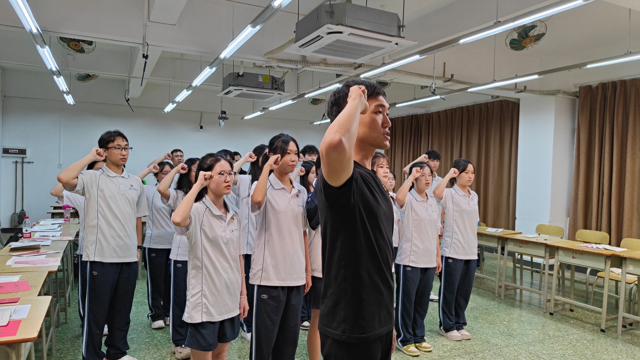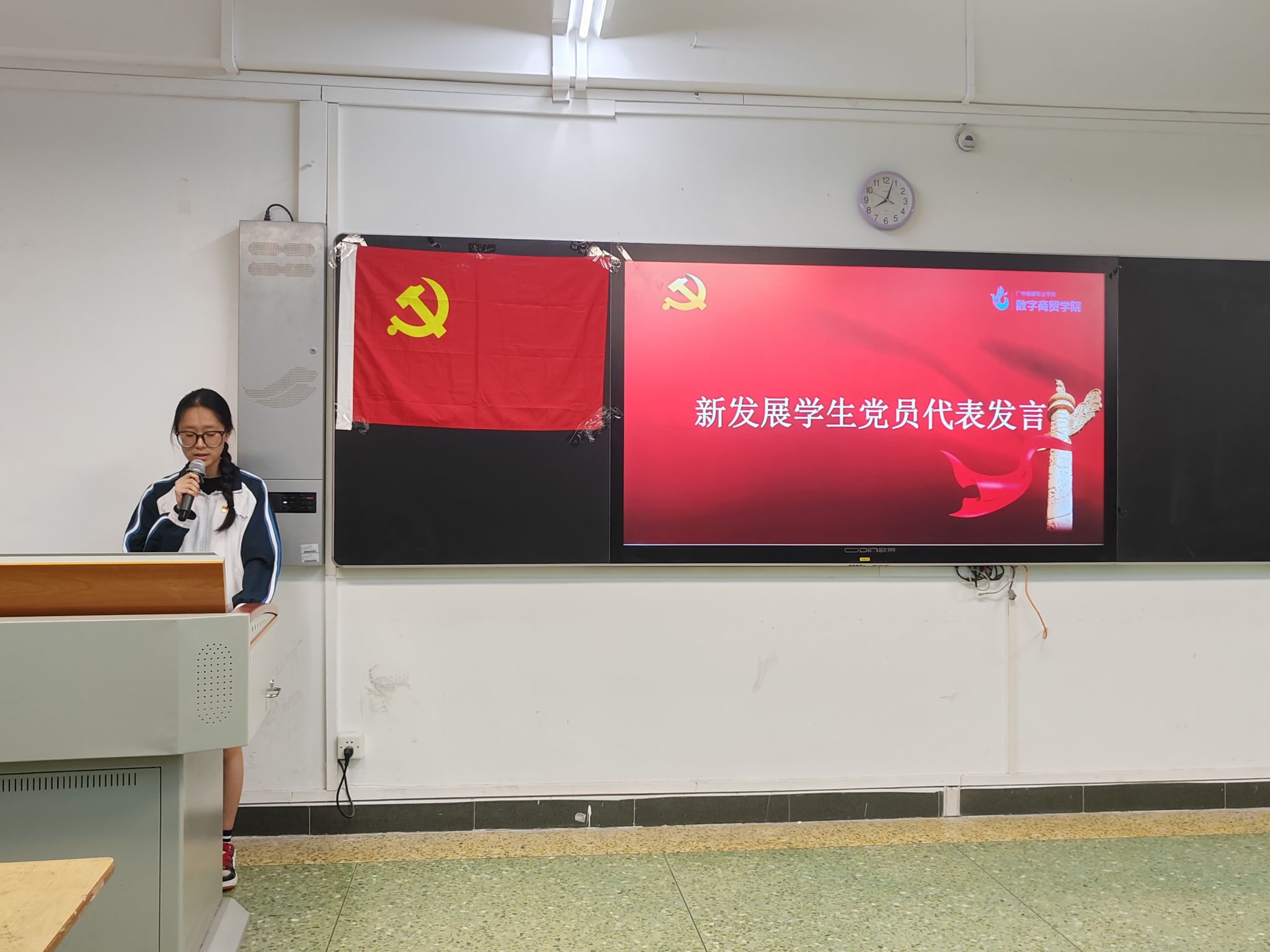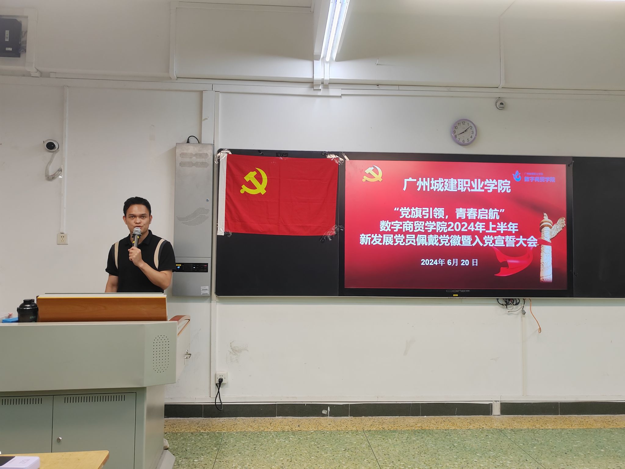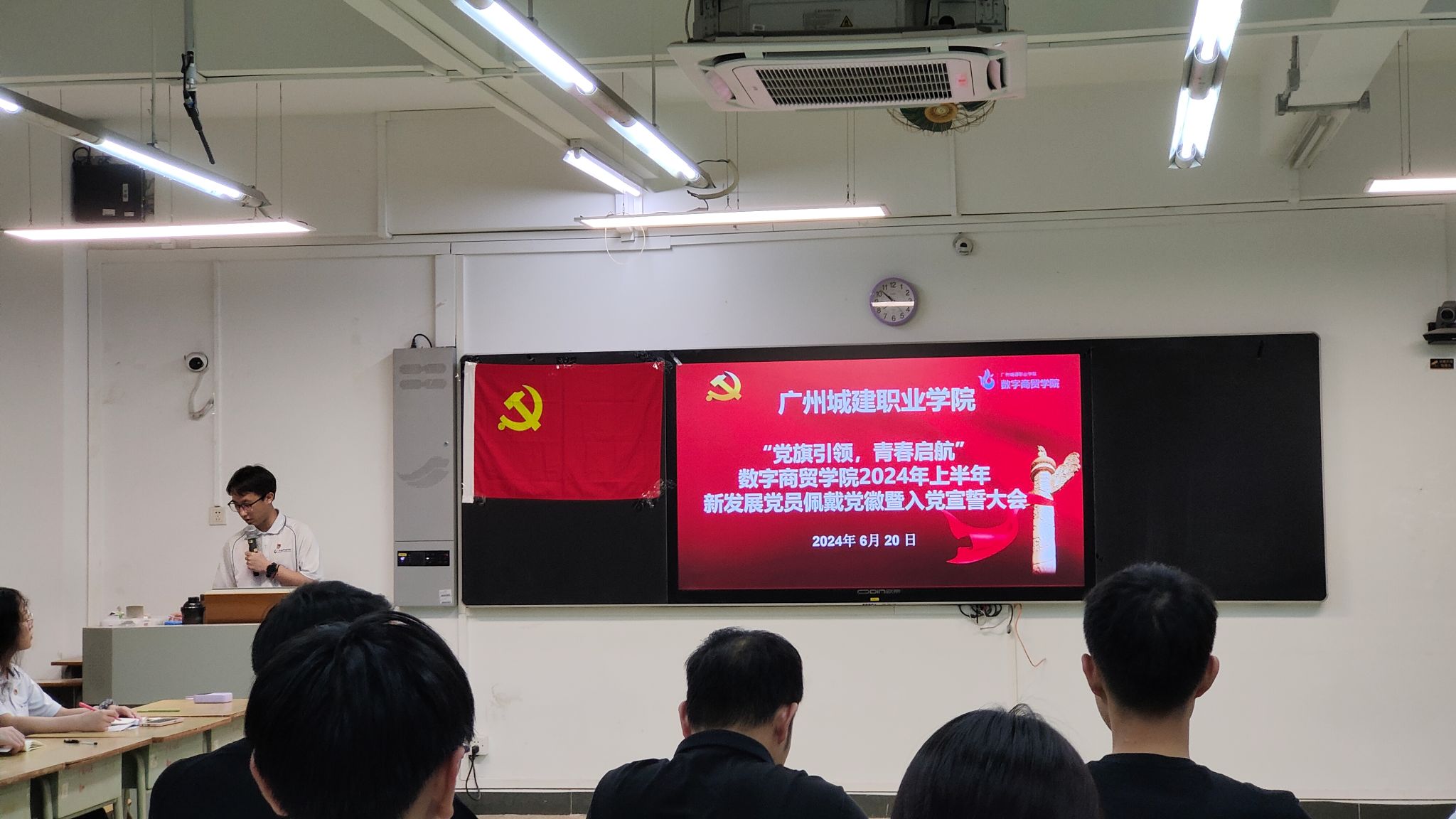 为进一步加强对新发展党员的教育和管理,提升新发展党员的党员意识和党性修养,增强新发展党员的身份意识,6月20日晚,数字商贸学院在人文艺术楼1206教室召开了2024年上半年新发展党员佩戴党徽暨入党宣誓大会。学院学生党建工作办公室指导老师崔伟壮、学生第一党支部书记邹鹏、学工办全体辅导员、学生党支部全体在校生党员出席参加大会。大会由预备党员、学生党建工作办公室副主任管丁捷同志主持。
