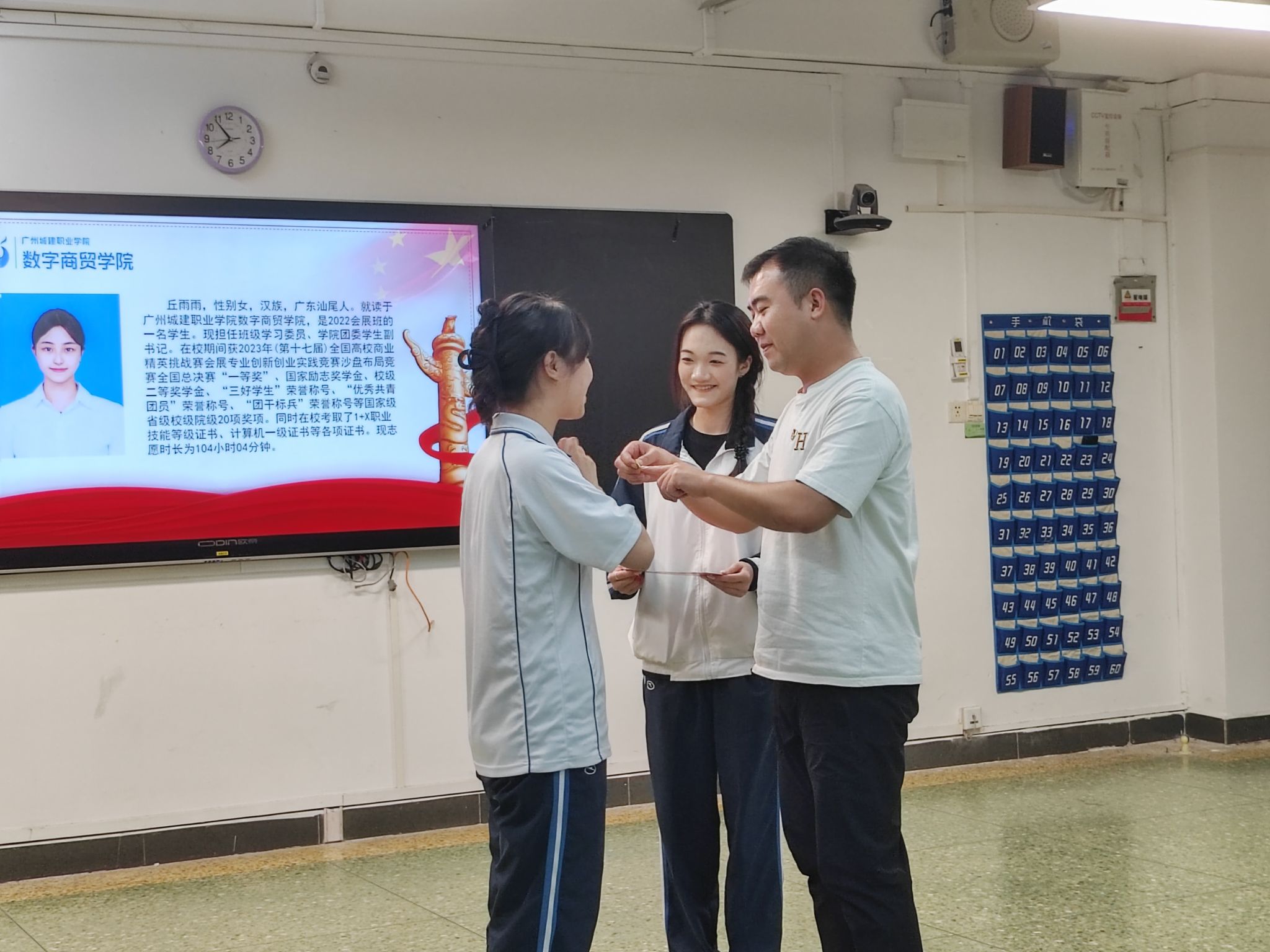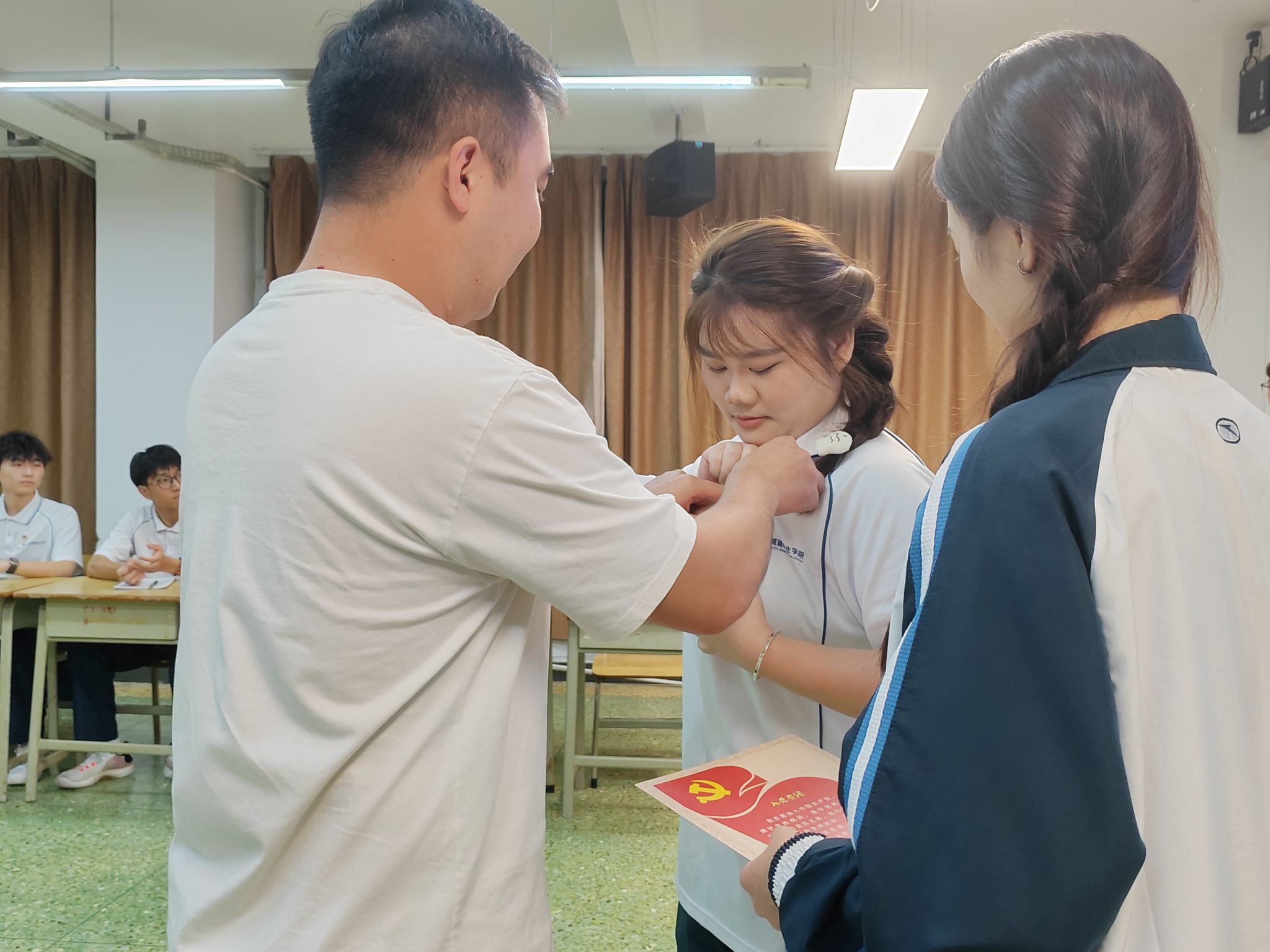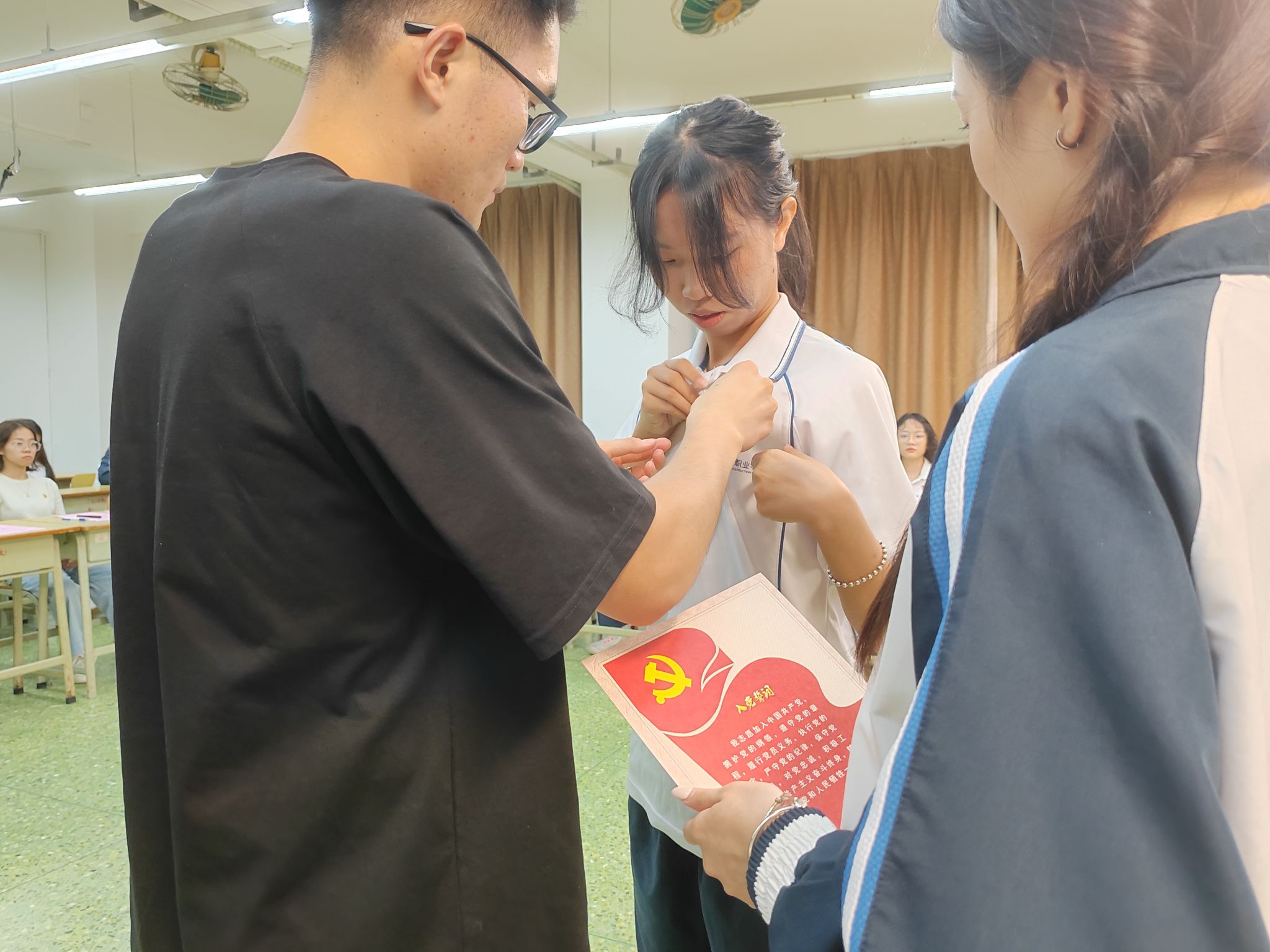 主持人宣读本次新接收的党员名单后,入党介绍人依次为新发展党员佩戴党徽,给同学们的入党仪式增加了一次难忘的回忆。