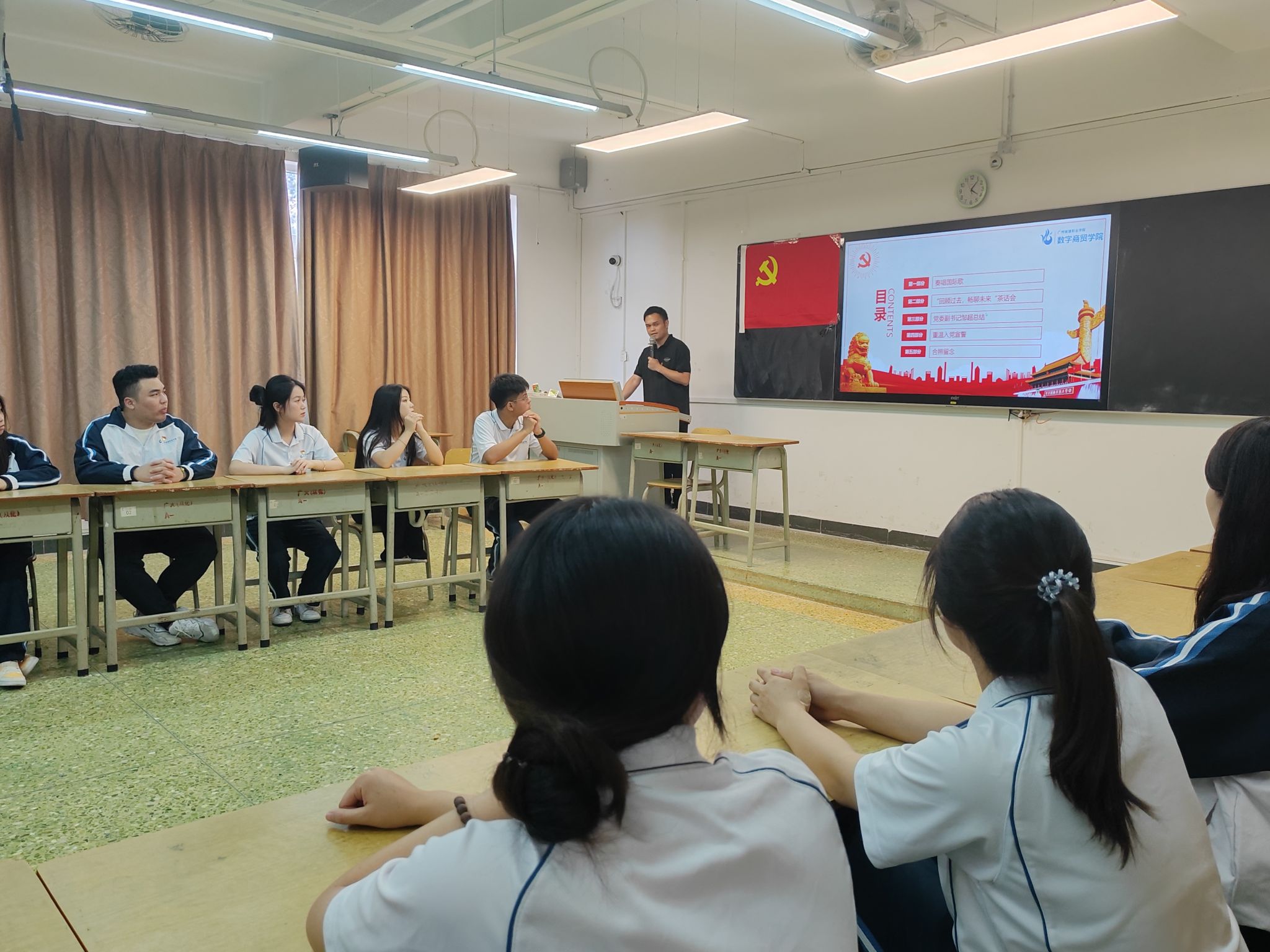 为进一步激励毕业生党员坚定理想信念,强化党员意识,加强党性修养,助力毕业生党员顺利走向社会,筑牢责任担当意识,更好地发挥党员的先锋模范作用,2024年6月21日下午,数字商贸学院在1208课室召开了“青春不散场,党旗永飘扬”2024届毕业生党员教育大会。学院党委副书记、副院长邹超,学生第一党支部书记邹鹏、2024届毕业班辅导员和2024届全体毕业生党员出席本次大会。大会由学生党建工作办公室指导老师崔伟壮主持。