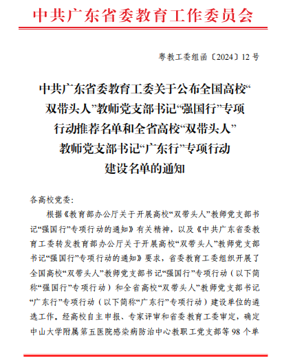 近日,中共广东省委教育工委公布了全国高校“双带头人”教师党支部书记“强国行”专项行动推荐名单和全省高校“双带头人”教师党支部书记“广东行”专项行动建设名单。我院教师第一党支部入选全国高校“双带头人”教师党支部书记“强国行”专项行动推荐名单。此次入选,是我院继获得“全国党建工作样板支部”与“全省党建工作样板支部”称号后,在党建工作方面的又一重要突破,是学校唯一入选的支部!