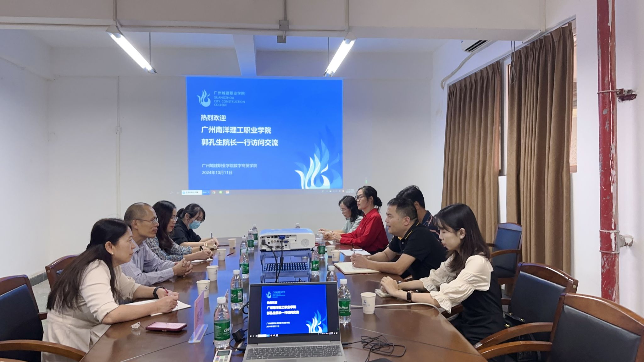 10月11日下午,广州南洋理工职业学院人文与教育学院院长郭孔生、外语教研室主任尚丽媛、副主任廖莎,教师宁莉一行4人莅临我院交流学习。交流会由学院党委书记、院长赵团结主持,商务英语教研室主任梁志华、副主任温舒蕾,骨干教师张云瑞、李琪出席了会议。