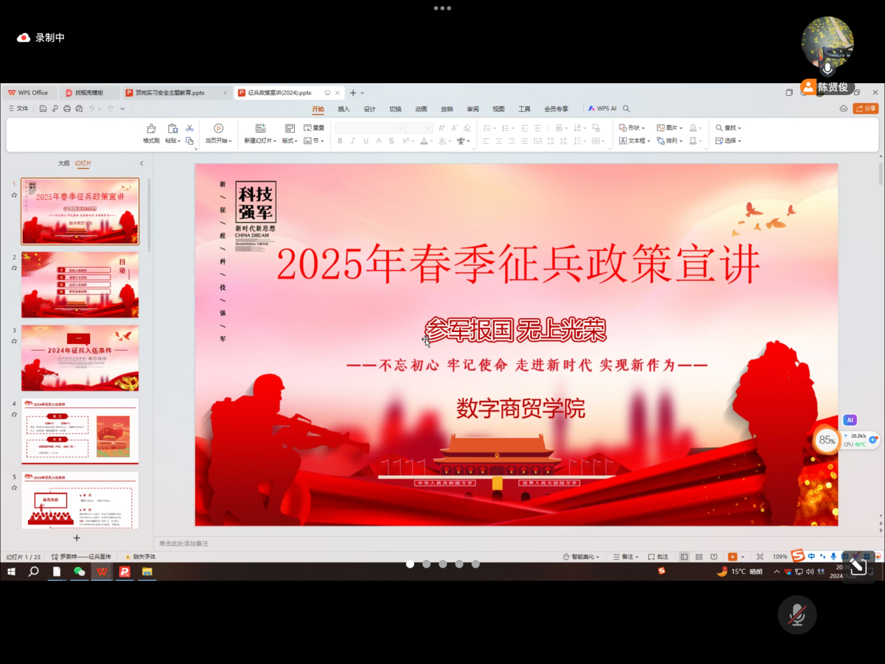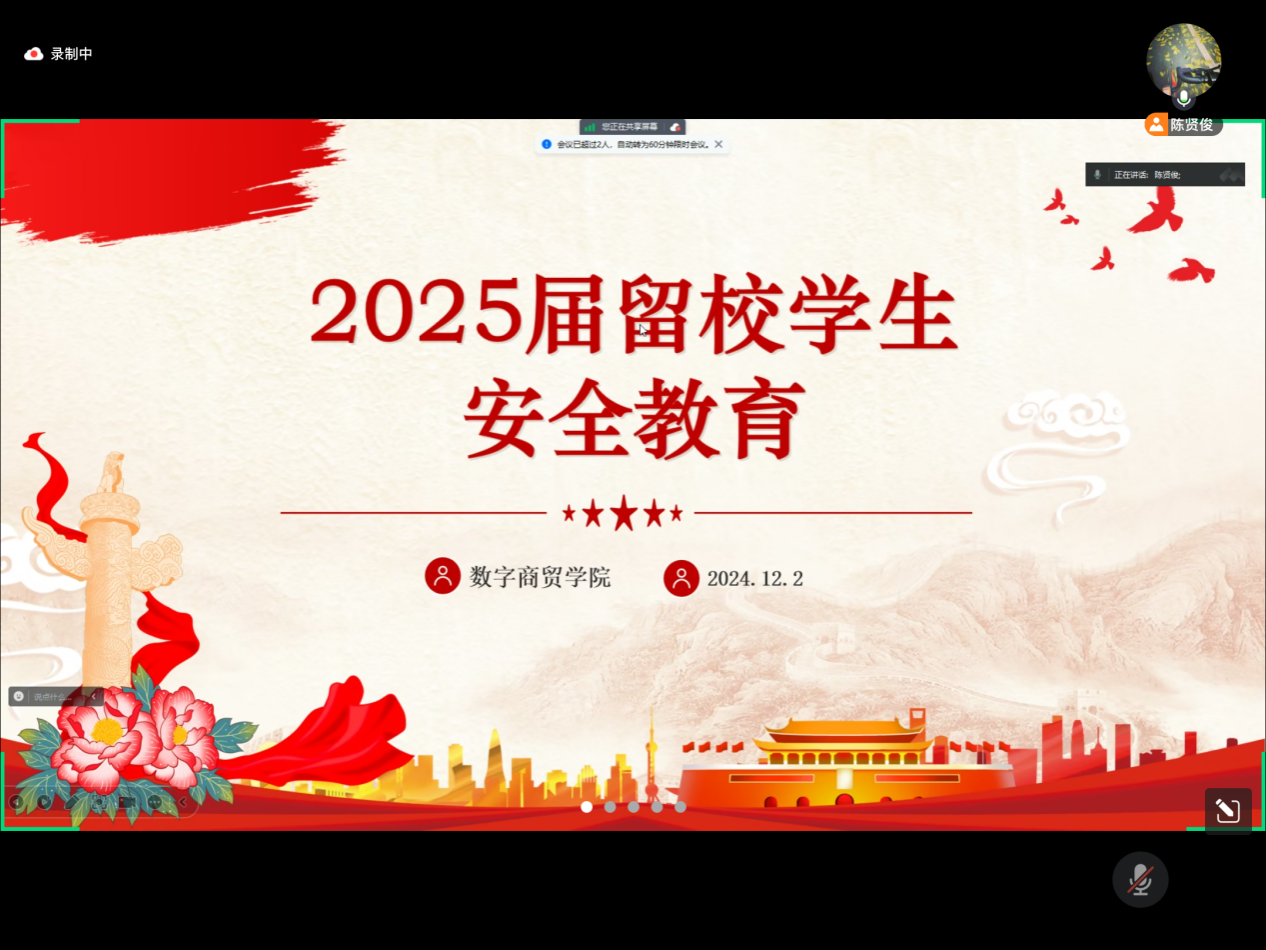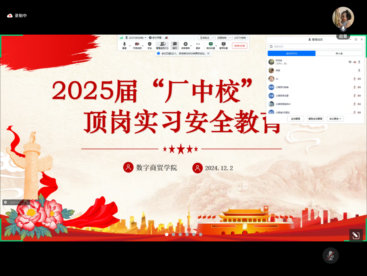 2024年12月2日,数字商贸学院针对参与“厂中校”项目的84名2022级毕业班学生,成功举办了一场以“顶岗实习安全教育”为主题的线上班会。此次班会旨在加强学生的安全意识,确保参加“厂中校”项目实习期间能够安全、顺利地完成工作任务。学院辅导员陈贤俊、陈泽敏、杨启慧全程参与本次线上班会,共同为学生们提供指导和帮助。