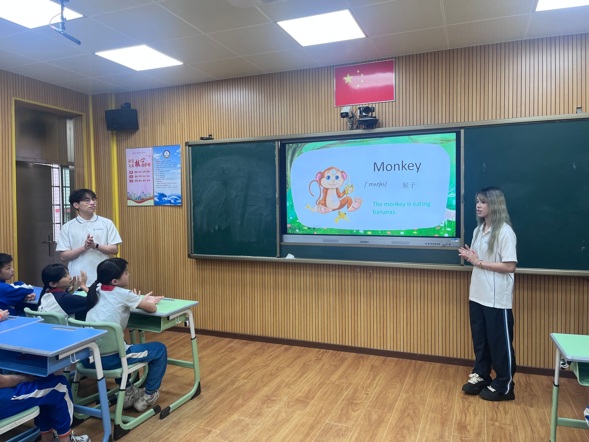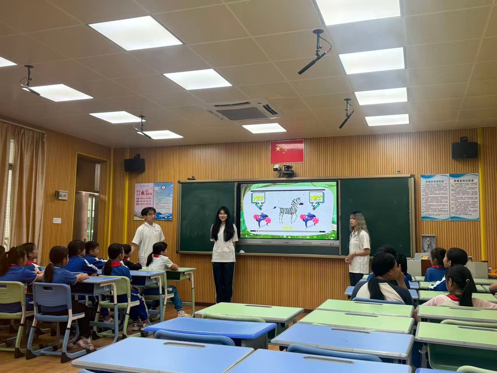 团队紧密结合小学生的认知规律与学习特点,运用色彩鲜明、生动形象的科普图片,带领孩子们认识老虎、熊猫等多种珍稀野生动物,并在趣味引导中掌握对应的英文单词。同时,通过播放主题短视频,以直观鲜活的画面展现野生动物的生存现状与重要生态价值,让孩子们在视听结合中感受自然之美,理解保护野生动物的重要意义。