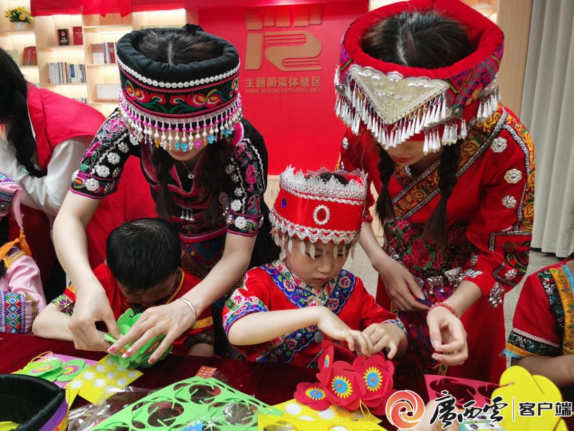 “绣球由12瓣组成,代表一年12个月,每种颜色有不同的寓意,小小的绣球沉淀的是壮家儿女的智慧,也蕴含着壮族文化的独特风韵……”在制作手工绣球环节,志愿者们先介绍了绣球的传说、组成、制作方法,并向大家演示每一步的步骤。小朋友们在志愿者的指导下,手拿各色绣球素材,神情专注地开始创作。