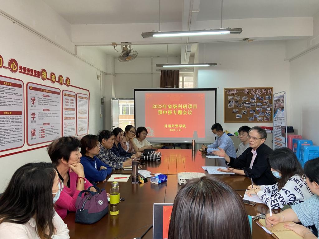 4月21日下午,根据学校《2022年科研平台和科研项目预申报工作方案》和《外语外贸学院2022年省级科研项目预申报工作方案》的部署,外语外贸学院召开了2022年省级科研项目预申报专题会议。根据专家研究领域、专业背景和已收到的16份科研课题预申报书内容,特邀请华南师范大学博士生导师彭虹斌教授、学校凤凰学者青年人才刘一书教授等五位校内、外专家,通过线上、线下指导的形式,分组对申报书的项目申报书进行一对一指导。会议由李霜副院长主持。