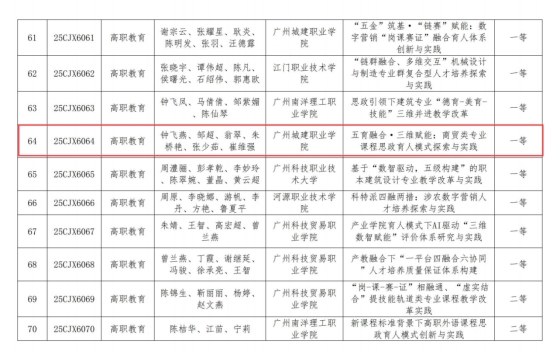 近日,广东省教育评估协会发布《关于广东省教育评估协会第六届教育教学成果质量评定结果的公示》(粤教评协〔2025〕29号)。由我院钟飞燕教授主持,联合桥集拉德外贸综合服务(广州)有限公司(广东省校外实践基地)及广东机电职业技术学院共同研发申报的项目《五育融合·三维赋能:商贸类专业课程思政育人模式探索与实践》,荣获第六届教育教学成果质量评定一等奖,这一成果彰显了我院在校企合作、校校协同推进教育教学改革方面取得的重大突破,标志着我院育人工作再上新台阶。
