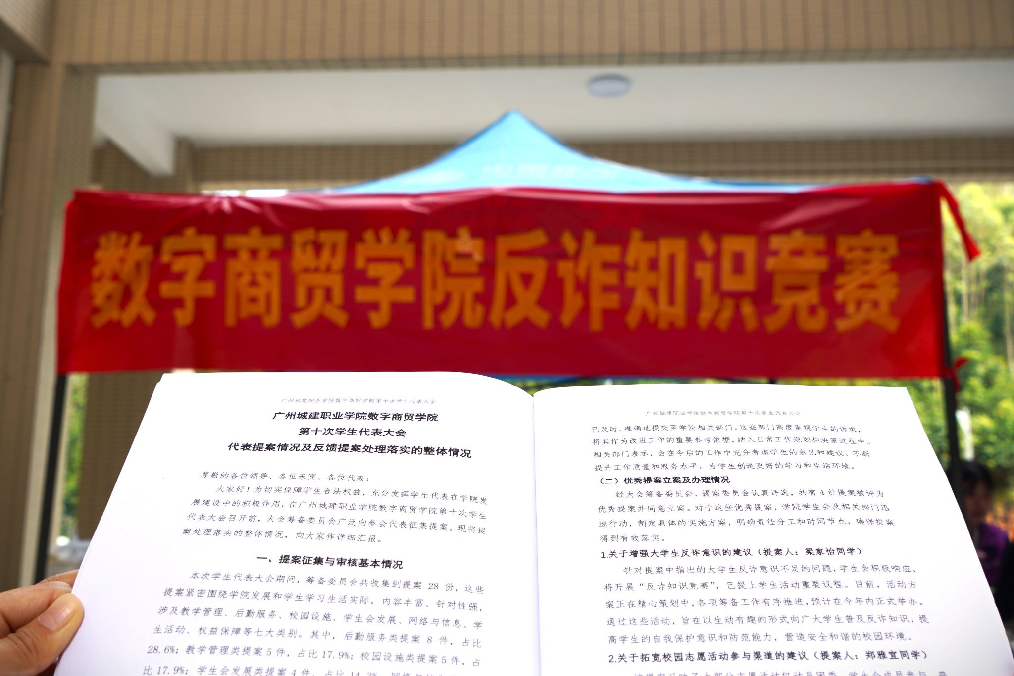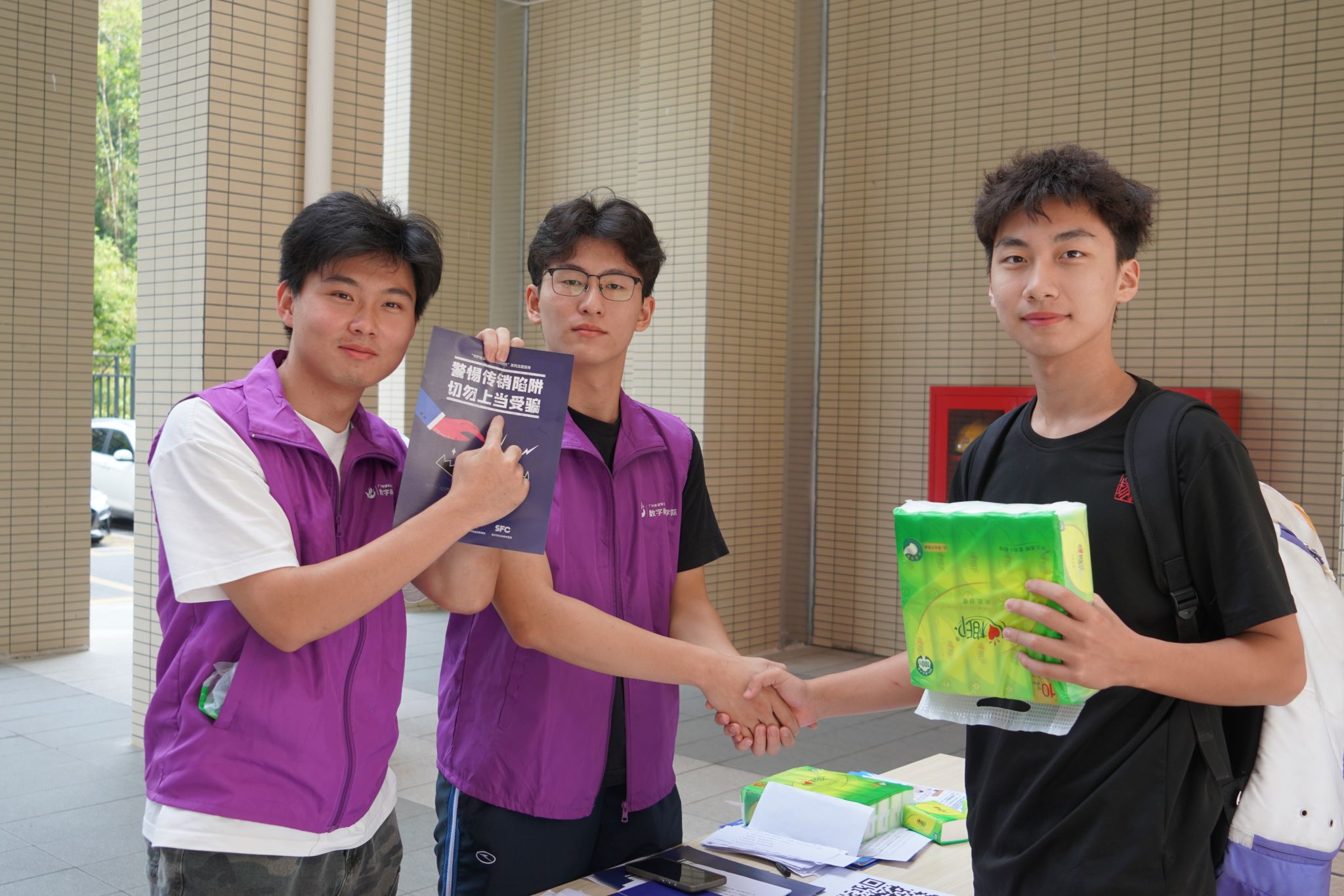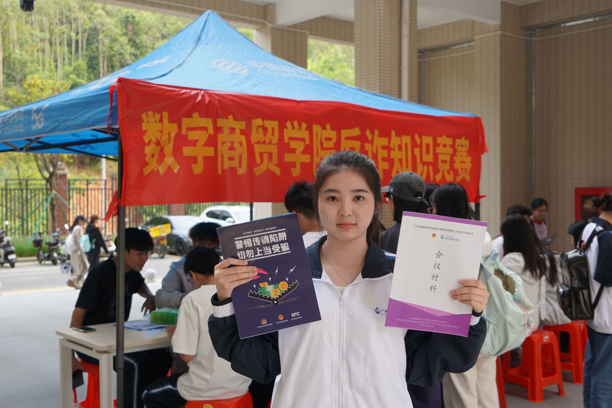 为切实增强全院学生反诈骗意识与风险防范能力,精准落实广州城建职业学院数字商贸学院第十次学生代表大会会议精神,响应大会代表梁嘉怡同学提出的 “关于增强大学生反诈意识”的建议提案,10月29日,学院学生会在校园内组织开展反诈骗知识竞赛活动。活动采取 “摆摊答题+宿舍普及任务” 的形式,累计覆盖学生1000余人,取得良好宣传教育效果。