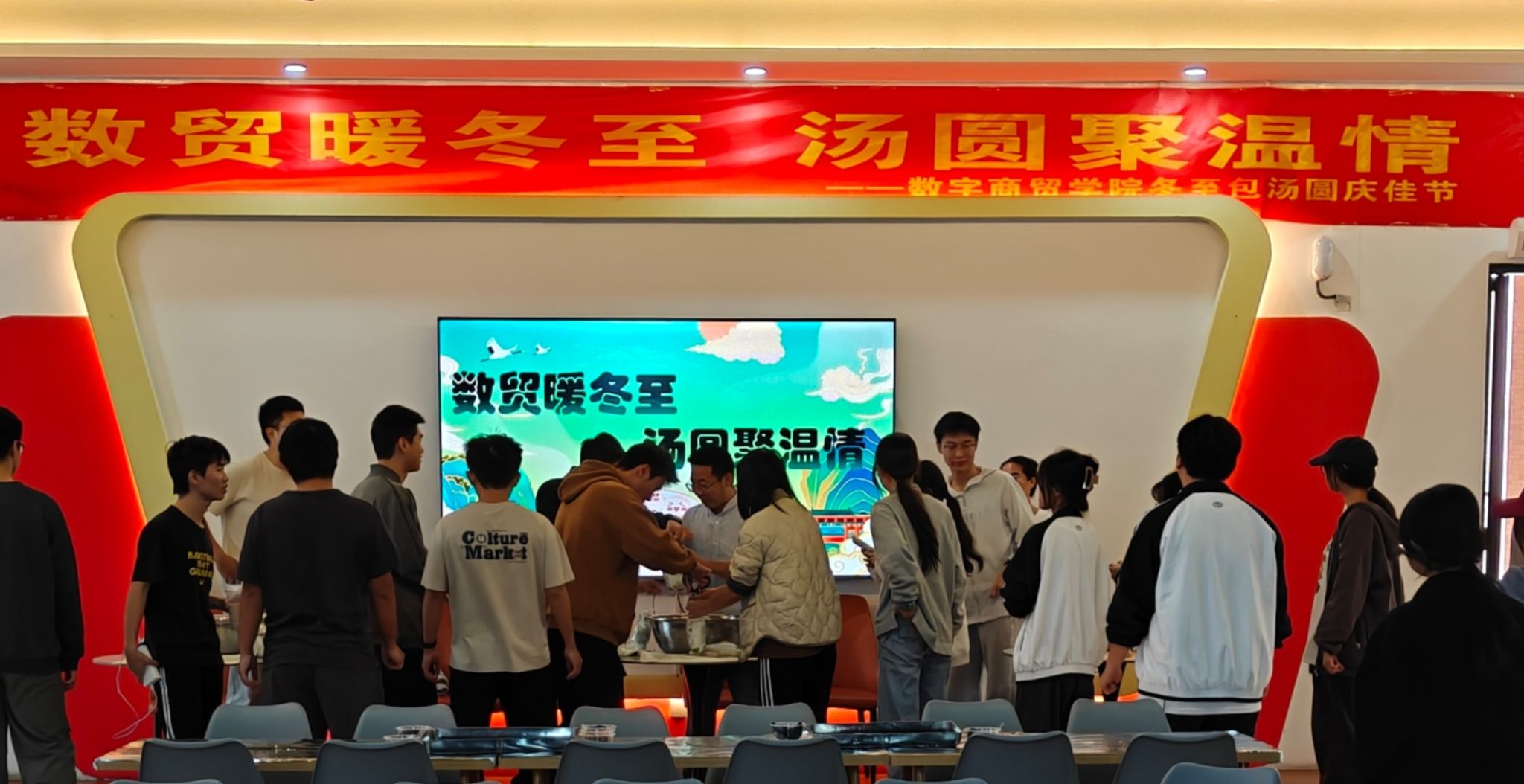冬至情浓暖校园,汤圆飘香话团圆。在冬至佳节来临之际,为弘扬中华优秀传统文化,营造温馨和谐的校园氛围,12月19日,数字商贸学院在清远校区学生食堂三楼组织开展了“数贸暖冬至,汤圆聚温情”包汤圆主题活动。学院党委副书记、副院长邹超以及学工办全体辅导员老师出席本次活动。