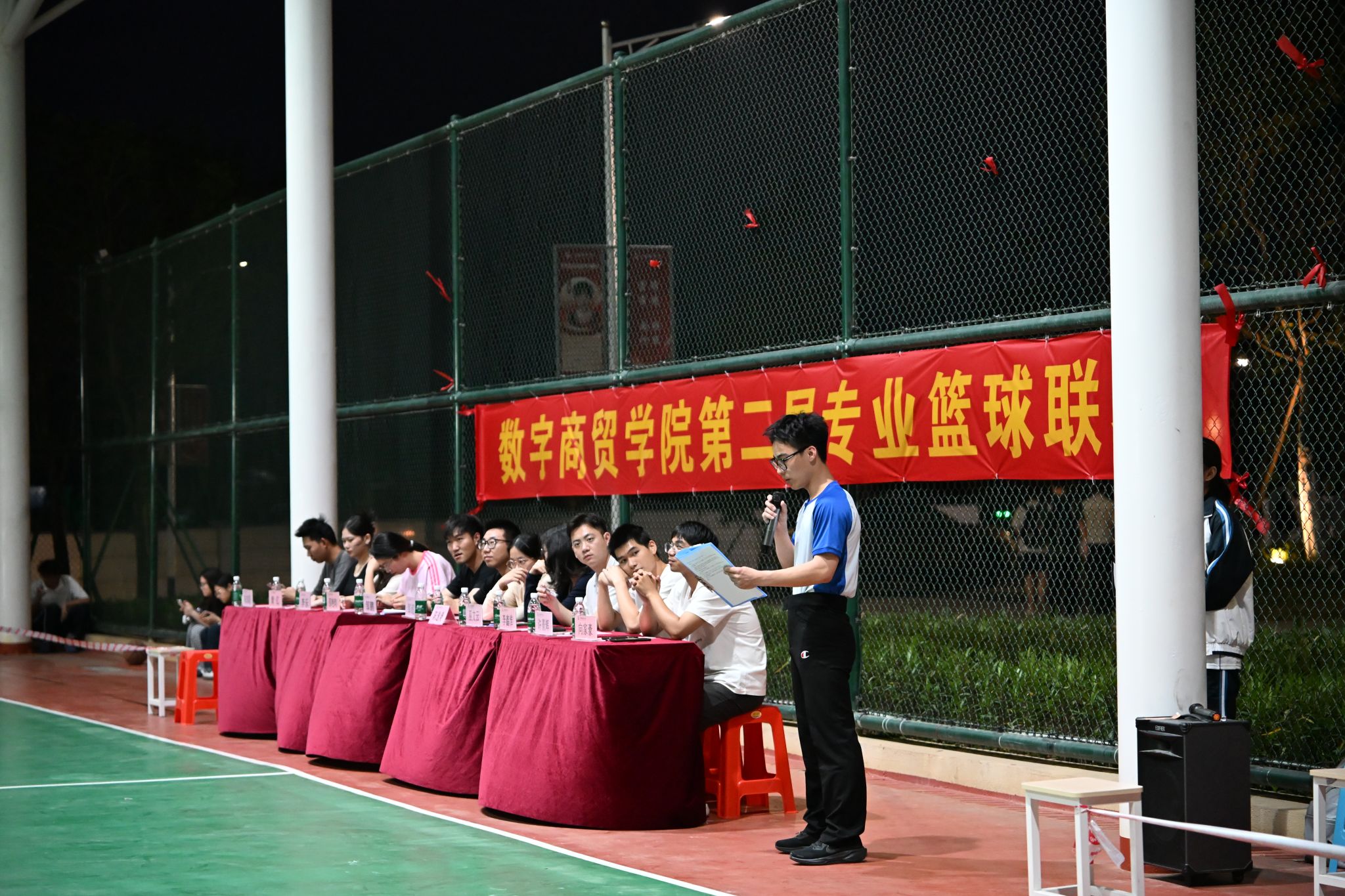 开幕式上,主持人有序开场,向莅临现场的领导、老师,以及所有参与人员致以欢迎和感谢,简要介绍了本次篮球赛的筹备情况与赛事安排,明确赛事核心宗旨不仅是为学子提供交流展示的平台,更希望以赛事为契机,带动更多学生走出宿舍,远离电子设备,主动参与体育锻炼,在运动中增强体质、收获友谊。