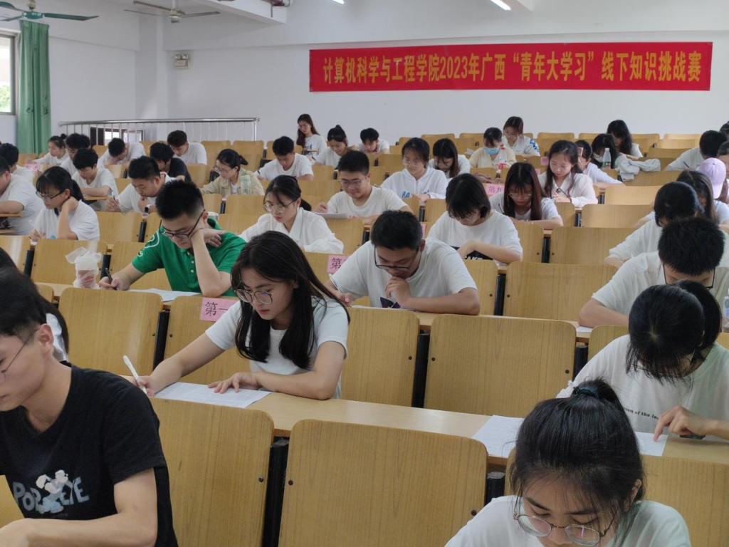 为了深入贯彻落实习近平新时代中国特色社会主义思想,全面学习贯彻党的二十大精神,更好团结引领广大壮乡青少年积极投身新时代壮美广西建设,谱写中国式现代化广西篇章贡献青春力量,5月14日下午,我院于我校东校区厚德2202教室开展2023年广西“青年大学习”党的二十大精神知识挑战赛院赛。各班团支部组队参加了此次的挑战赛院赛。