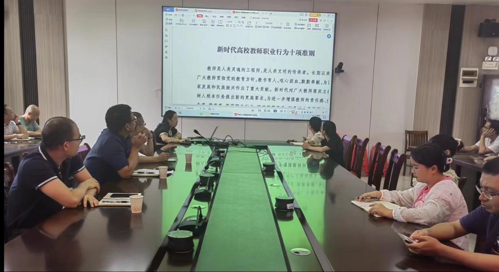 紧接着,方琨结合自身的学习心得,带领大家详细学习了教育部公开曝光的十二批共86起违反教师职业行为十项准则的典型案例,引导全体教师以案为鉴,做到警钟长鸣。随后,方琨带领全体教师,对新时代教师职业行为十项准则的主要内容,包括坚定政治方向、自觉爱国守法、传播优秀文化、爱岗敬业、关爱学生、诚实守信、廉洁自律等方面进行逐条,详细学习和深刻解读,强调大家要提升教师的规则意识,并激励广大教师坚定理想信念、厚植爱国情怀、涵养高尚师德。
