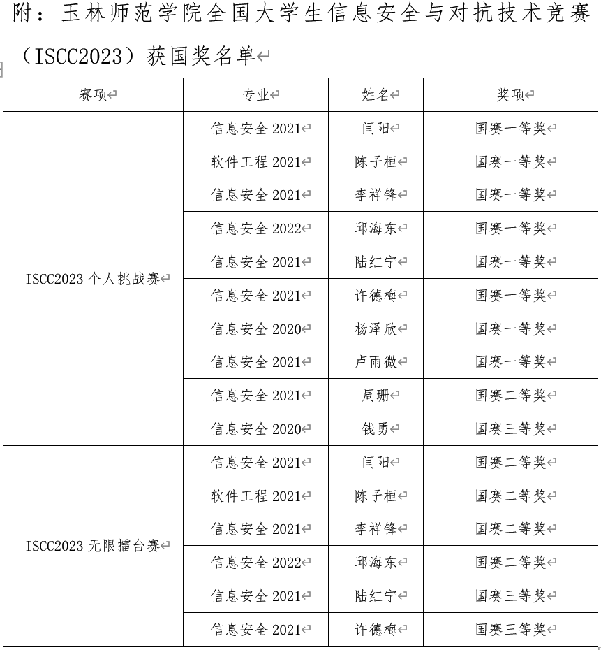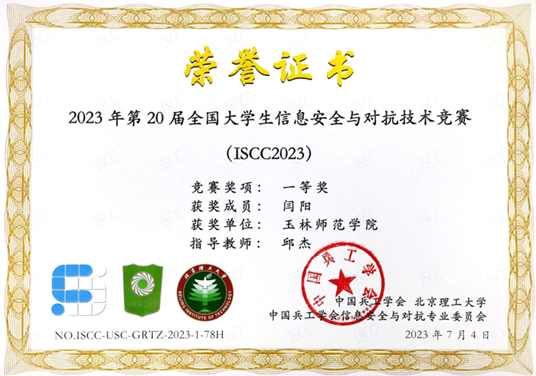 近日,全国大学生信息安全与对抗技术竞赛(ISCC2023)成绩揭晓,我校代表队由计算机科学与工程学院学子组成,并在邱杰老师的带队指导下荣获第20届全国大学生信息安全与对抗技术竞赛全国一等奖8项、二等奖5项、三等奖3项。