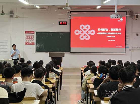 为提高新生对专业知识领域的认知度和适应度。10月10日下午,我院于学校东校区厚德1203教室举行主题为岭南都会 智慧随行2023级新生专业教育讲座。此次讲座邀请中国联通玉林分公司副总经理郑允富主讲,我院党委副书记黄潮主持。