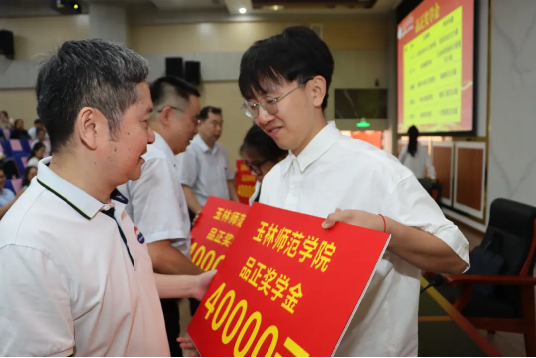 据悉,“品正奖学金”创立于2022年11月,由玉林市品正商贸有限公司向我校教育发展基金会捐资200万元设立,分10年捐赠,每年捐赠20万元,主要奖励我校有突出表现的3名至5名全日制在校学生。