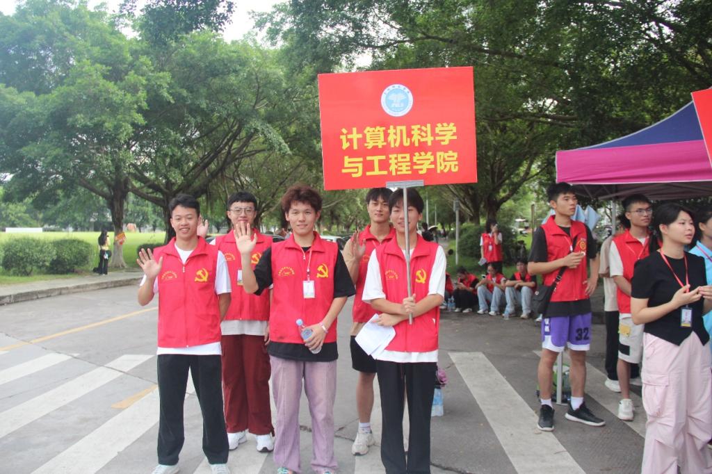 我院充分发挥奔腾“1+1”志愿服务团的作用,组织大学生志愿者参与迎新工作。志愿者们身着统一的红色马甲,背后印有计算机科学与工程学院和“志愿者”字样的醒目徽章,他们手持色彩鲜明的指引牌,整齐划一地排列在校门口,面带微笑,眼神中充满期待与热情。每当有新生及家长踏入这片充满希望的校园,志愿者们便立即上前,用温馨的话语和贴心的服务,为他们指引方向,解答疑惑,让每一位初来乍到的新生都能感受到来自计算机学院大家庭的第一份温暖与欢迎。