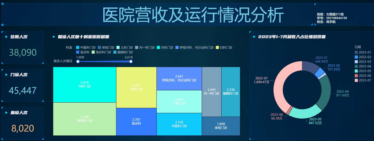 在企业导师的带领下,2021级的同学完成FineBI可视化实训和前端可视化实训内容的学习,通过对FineBI大数据可视化工具的学习,熟练掌握添加数据、新增列、多表拼接、制作表格、柱状图、饼图、折线图、仪表盘、组合图等功能。并在实践周结束时自己设计完成医院营运数据分析可视化图表。