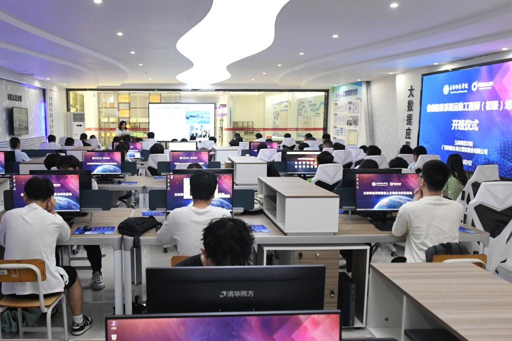 为新质生产力发展培养更多高素质技术技能人才,提升毕业生市场竞争力,5月7日,信创信息系统运维工程师(初级)培训开班仪式在我校东校区大数据学院展厅举行。学校副校长许进杰、教务处相关负责人、我院党政领导班子、清华同方计算机客服中心负责人、广西同德未来计算机股份有限公司负责人、广西新未来信息产业股份有限公司负责人、玉林市中职院校相关负责人及信创信息系统运维工程师(初级)培训班全体学生参加开班仪式。