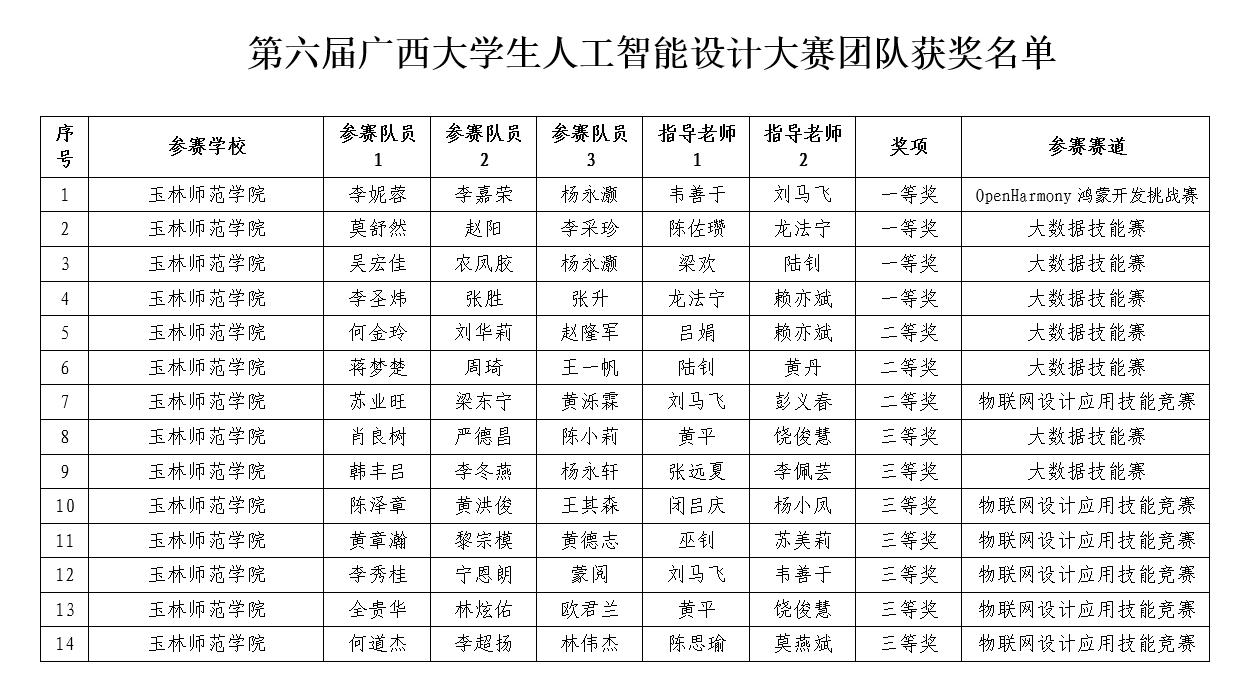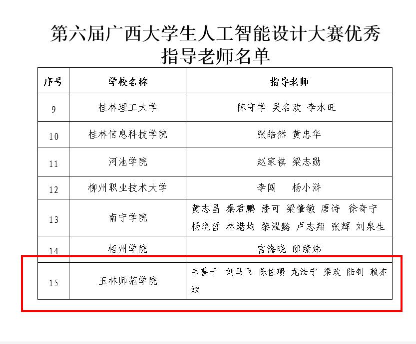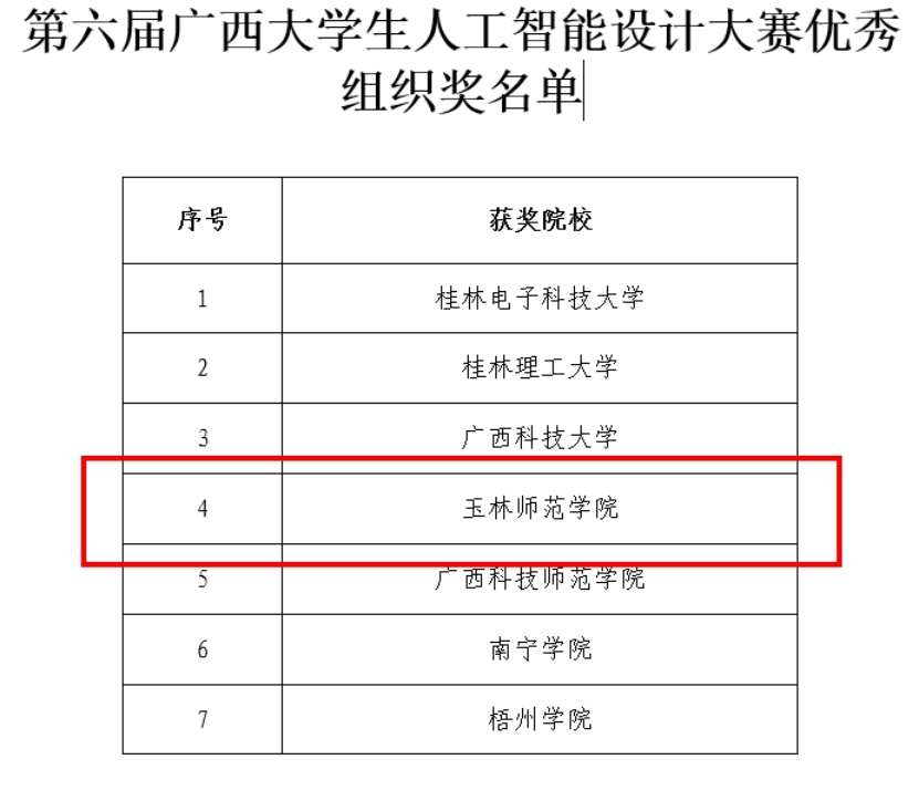 12月10日,第六届广西大学生人工智能设计大赛组委会传来喜讯,我校获第六届广西人工智能设计大赛优秀组织奖,我校7名教师获优秀指导老师奖,我校学子在大赛中获得一等奖4项、二等奖3项、三等奖7项。