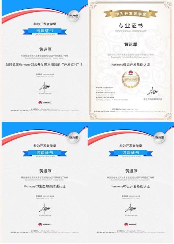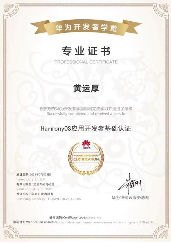 广州粤嵌科技公司邀请华为生态合作伙伴粤嵌科技HarmonyOS技术工程师执教,采用项目驱动的教学方法,通过引导学生参与实际项目开发,让学生在实践中学习和掌握HarmonyOS应用开发的相关知识与技能。学生顺利完成了本次训练营并通过考核获得了粤嵌科技颁发的《HarmonyoS应用开发者专项能力训练营结业证书》和华为开发者联盟颁发的《HarmonyOS应用开发者高级认证》专业证书;证书是对学生HarmonyoS应用开发能力的有力证明,对学生未来的就业和职业发展具有重要的推动。