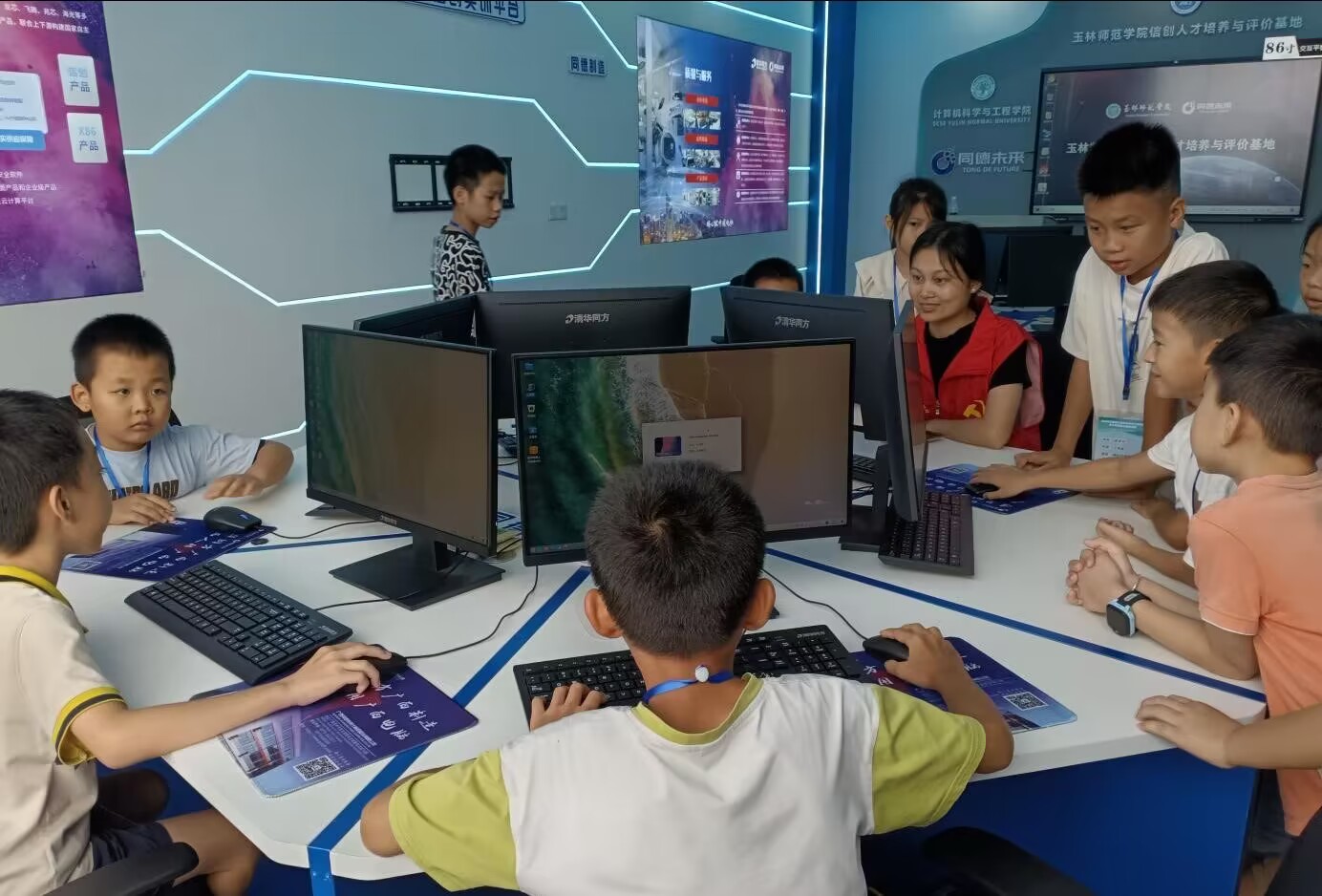 活动现场,李露璐老师对编程语言种类以及后续的教学计划进行充分的讲解,同时利用比较简单直观的编程环境对参加培训的中小学生进行创意编程启蒙教育,进一步激发受训学生对编程语言学习的热情。随后在志愿者的带领下参观了解玉林市大数据研究院、信创人才培养与评价基地、大数据机房及实验室、计算机实验教学中心等,让受训学生开阔眼界,培养学习兴趣,树立科技强国梦想。