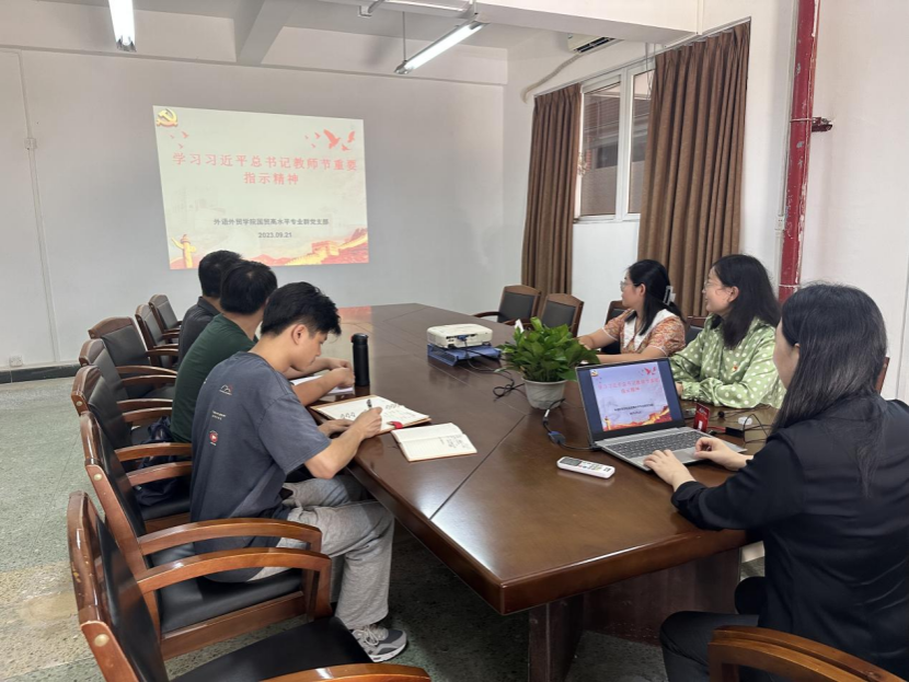 9月21日,外语外贸学院国贸高水平专业群党支部在人文艺术楼1305A组织全体党员教师深入学习贯彻习近平总书记教师节重要指示精神,学习活动由支部书记刘宁同志主持,支部全体党员出席。