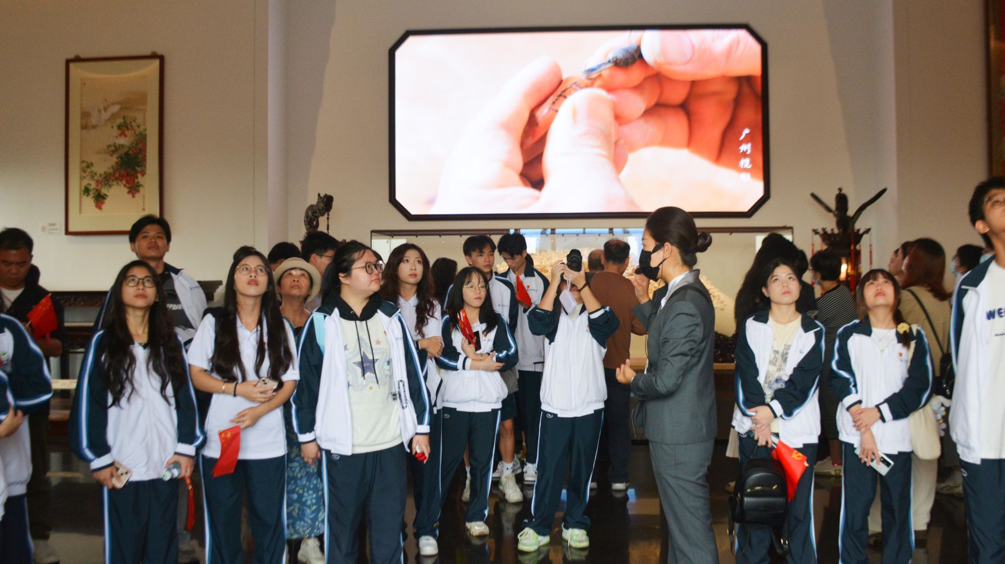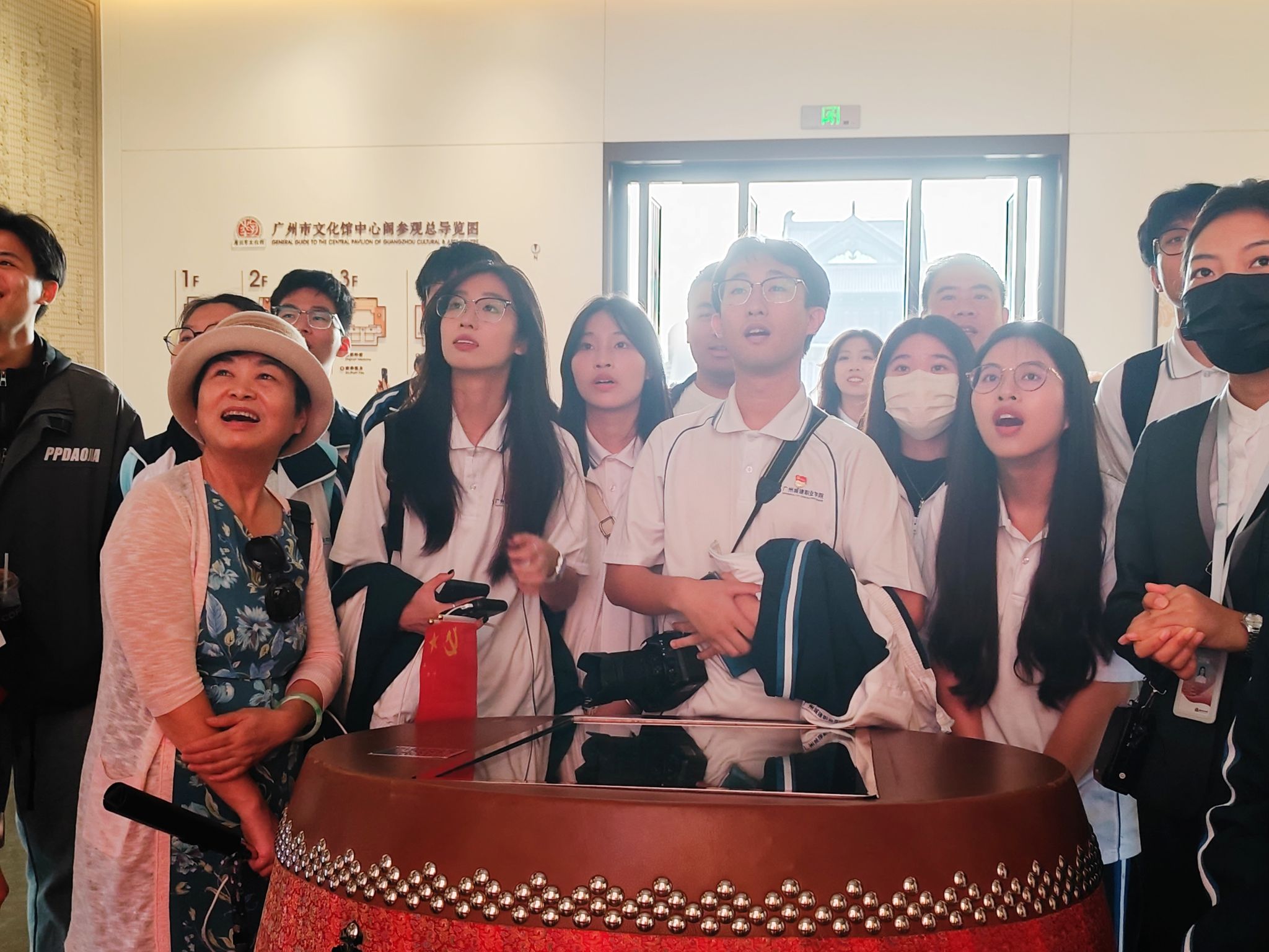广州市文化馆新馆是广州市重大文化设施和重点民生工程,也是全国最大的文化馆。在讲解员的带领下,师生党员一行走进这座历史韵味浓郁且富有现代气息的文化长廊,参观打卡了公共文化中心,“粤韵流芳”“食在广州”“岁时节庆”“医养岭南”“南拳强身”“广作华彩”“羊城古仔”七个板块的广府非遗文化展厅。近距离欣赏广绣广彩、珐琅牙雕、古琴粤剧、乞巧醒狮、茶药腊味、南拳咏春等非遗展品,切身体验馆阁内“漫画+电子交互+AR实景”等多种场景融合视听盛宴,感悟“花城百花开”的绚丽多姿。