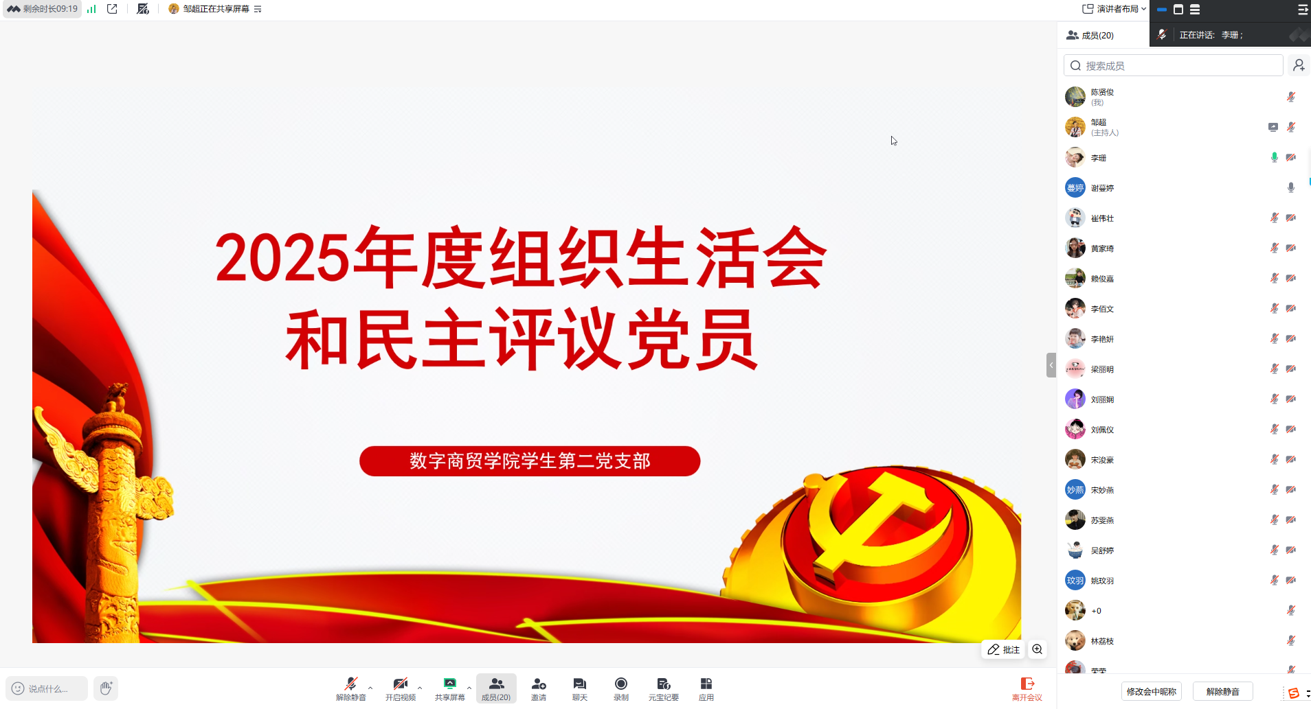 为深入学习贯彻习近平新时代中国特色社会主义思想,全面贯彻落实党的二十届四中全会精神,严肃党内政治生活,进一步增强党员队伍凝聚力和战斗力,数字商贸学院学生第二党支部于3月18日采取线上和线下相结合的方式召开了2025年度组织生活会和民主评议党员会议。学院党委副书记兼学生第二党支部书记邹超主持会议,党支部全体师生党员参加会议。