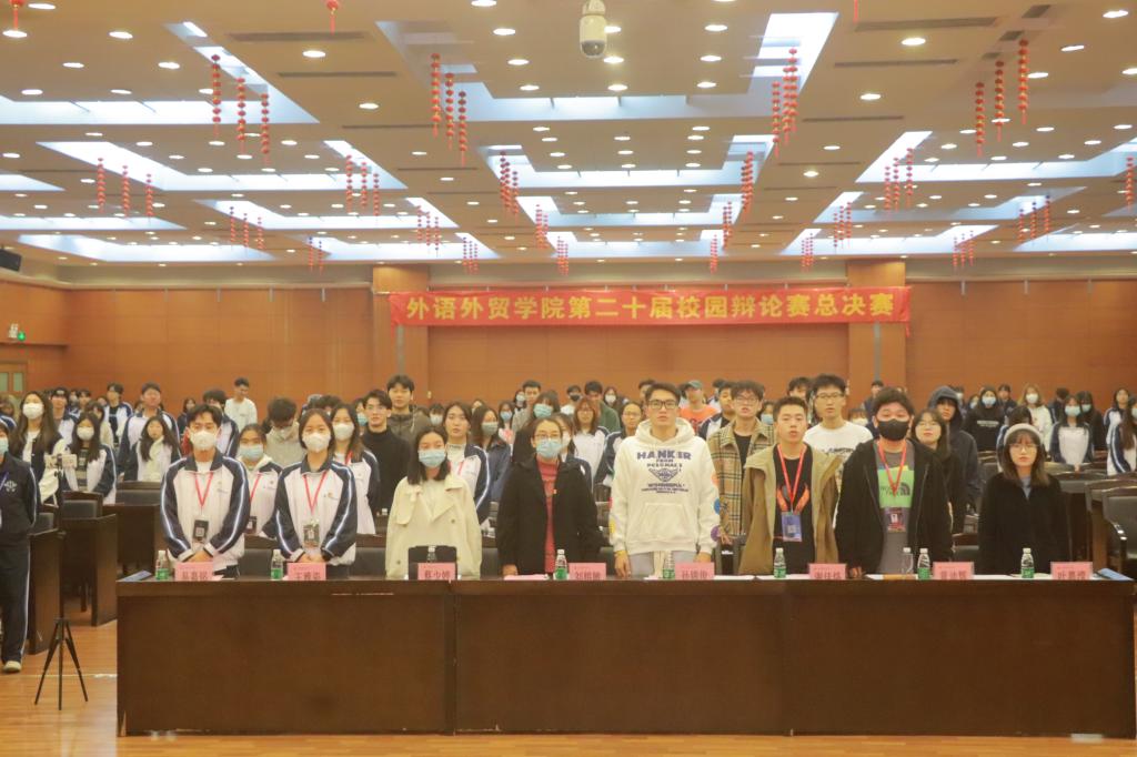 12月14日晚, 外语外贸学院在人文艺术楼四楼报告厅举行第二十届校园辩论赛总决赛,外语外贸学院党委副书记、学工副院长刘榕敏,院团委书记孙锦俊,辅导员蔡少婷以及全体参赛队伍出席了大赛。