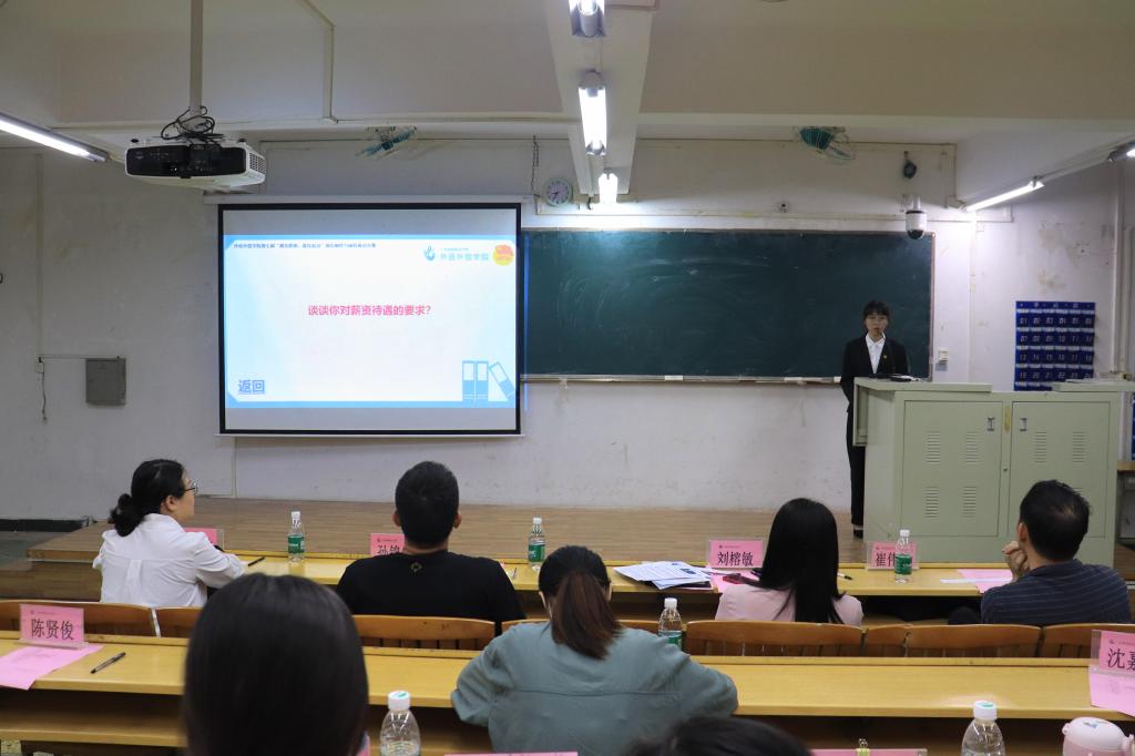 5月30日晚,为提升大学生的求职就业能力,丰富大学生校园生活,外语外贸学院在人文艺术楼205举行了第七届简历制作与模拟面试大赛。外语外贸学院党委副书记、学工副院长刘榕敏,院团委书记孙锦俊以及学工办20级辅导员们出席了本次大赛并担任评委。