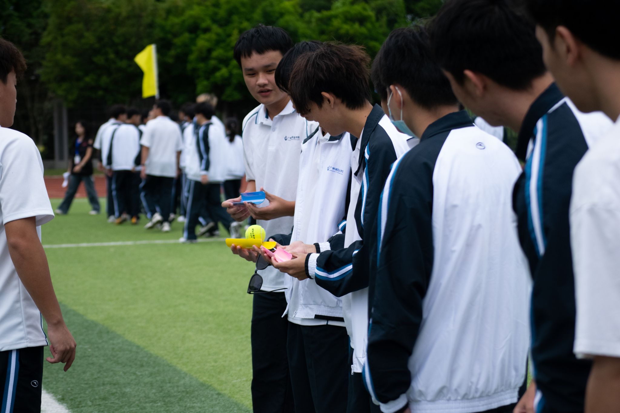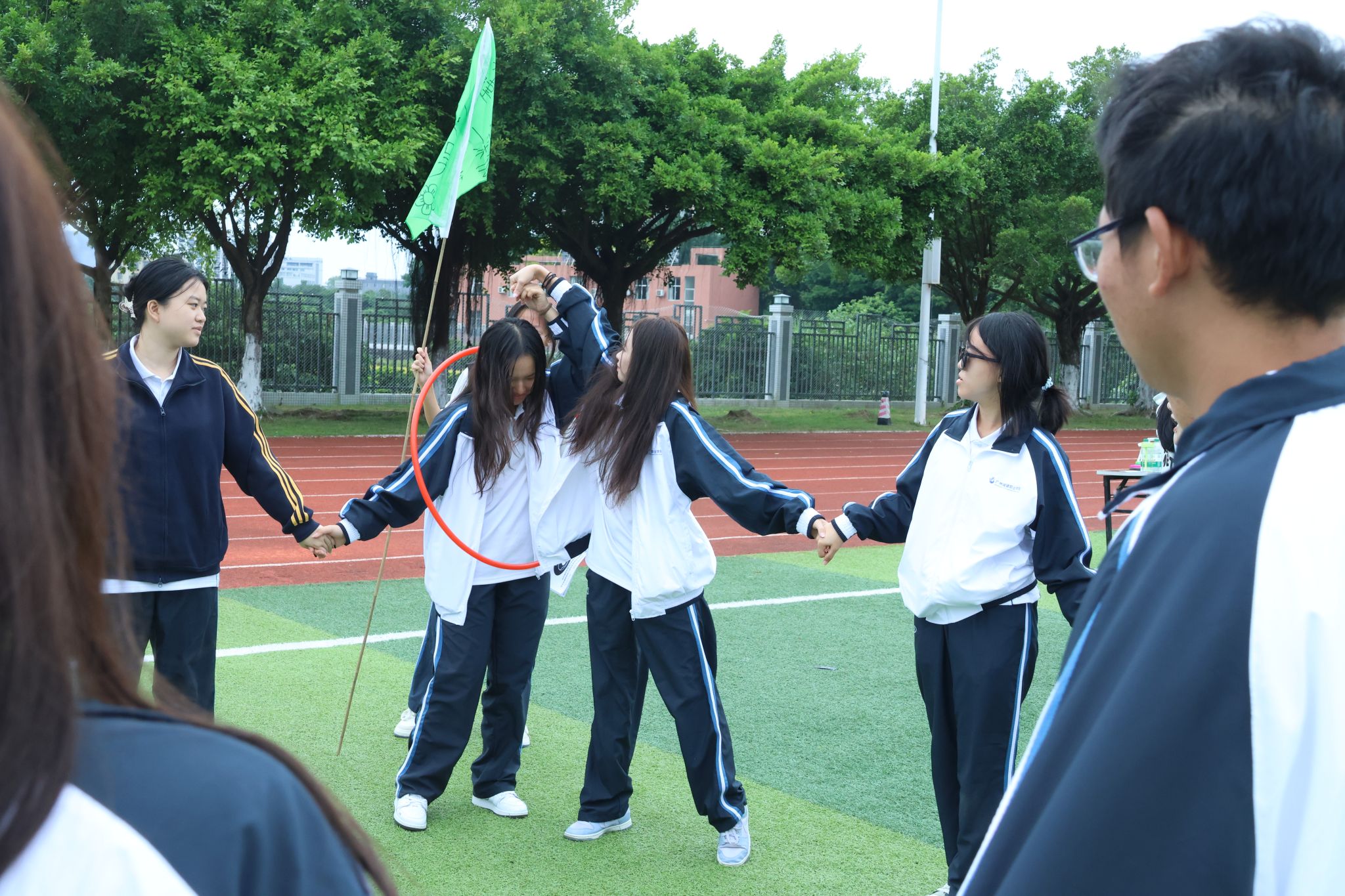 随后开展的户外素拓活动将运动会的气氛推向了高潮。“移花接木”项目中,同学们需要密切配合,精准传递手中的道具,稍有不慎便会影响整体进度,这极大地考验了他们的专注力与协作能力;“手心相连”环节,大家手挽手、心连心,共同克服困难,跨越障碍,每一步都凝聚着团队成员之间的信任与默契;“坐地起身”项目更是让大家深刻体会到了相互扶持的重要性,一个人的力量难以完成起身动作,只有依靠团队成员的共同努力,才能顺利站起;“吸管传皮筋”则充满了趣味性与挑战性,同学们小心翼翼地用吸管传递皮筋,现场笑声不断,在轻松愉快的氛围中拉近了彼此的距离。这些精心设计的项目,无一不让新生们在活动中积极参与、深度互动,现场欢声笑语此起彼伏,气氛热烈非凡。