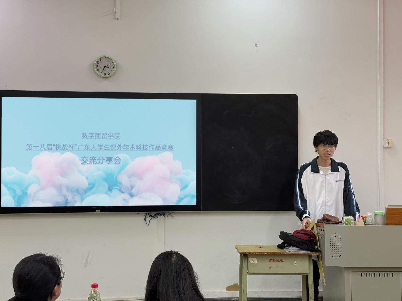 随后,学生代表苏子煜登台,以亲身参与者的视角,生动讲述了自己的比赛经历。从最初组队时的迷茫探索,到项目推进过程中的重重困难,再到赛场上的紧张答辩,苏子煜用一个个鲜活的故事,让在场师生仿佛置身于激烈的竞赛现场。他还分享了自己在比赛中积累的宝贵经验,如与团队成员高效沟通的技巧、面对评委犀利提问时的应对策略等,这些来自“赛场一线”的实战心得,让台下的同学们感同身受,也更加坚定了他们参赛的决心。