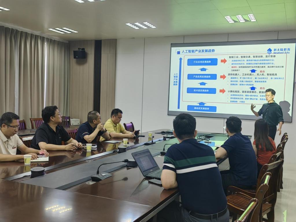 5月29日下午,我院与新大陆时代科技、广西泰荣科技公司,于厚德楼2401会议室开展“人工智能专业建设与产教融合”访企拓岗专项交流。我院党委书记方琨、院长陈佐瓒等领导与专业负责人参会。新大陆时代科技人工智能与物联网产品部总监游克华、广西泰荣科技公司总经理宋玮俊代表企业出席。