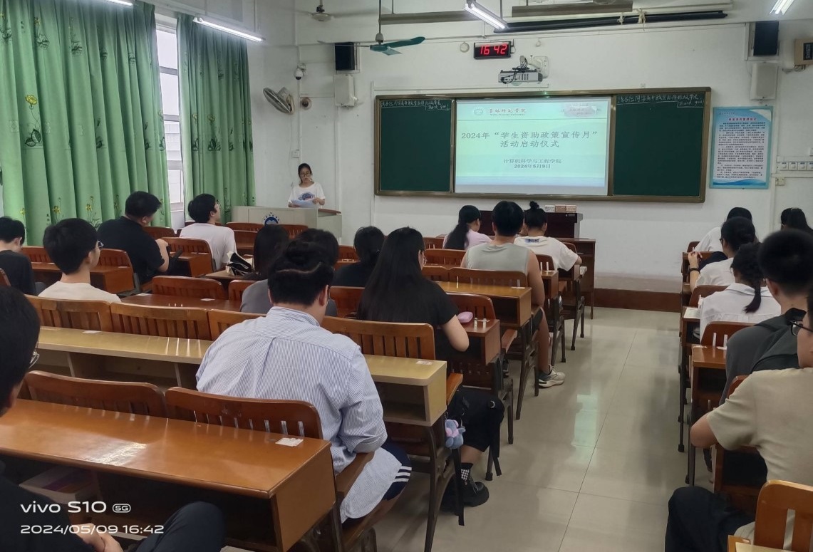 5月9日,我院于我校东校区厚德楼3-504教室举行2024年“学生资助政策宣传月”活动的启动仪式。仪式由学院辅导员丘海冰主持,学院各班班长以及生活委员参加此次仪式。