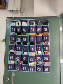 班级手机袋负责人在预备铃响前组织同学们将手机关机或调为静音状态,按照学号的顺序放入教室的手机袋中,对未放手机的空袋子编号做好登记,及时汇报辅导员。课后,任课老师组织同学们有序拿回自己的手机,有效的杜绝手机错拿或者丢失事件的发生。