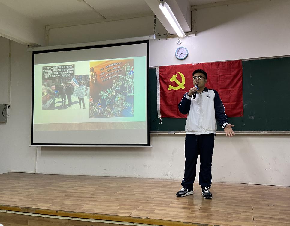 最后,刘星佐进行总结。入冬以来,国内疫情多点散发,接下来又将面临学生返乡和春节人员流动的巨大压力。身为当代大学生,应当在各个方面充分发挥青年的先进作用。学习抗疫防疫知识,从正规渠道接收疫情新闻,配合省市和社区的防疫要求,形成“抗疫防疫我配合,听党指挥跟党走”的良好氛围。