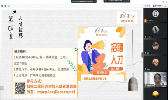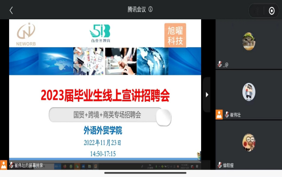 3场宣讲招聘会均采取腾讯会议的形式进行,学院科研副院长李霜、学工副院长刘榕敏和2020级全体商务英语、国际经济与贸易以及跨境电商专业学生参与了会议,会议由学院辅导员崔伟壮主持。