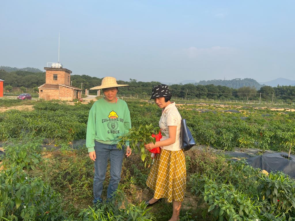 吕海燕研究员和伍思丹书记在大坪岗村辣椒种植基地