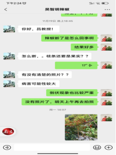 在大坪岗村辣椒种植基地,吕海燕在塔脚村驻村书记伍思丹的陪同下,走进辣椒种植基地,认真查看辣椒生产情况。当发现辣椒出现倒伏和折枝的现象后,立即拍照发给仲恺农业工程学院吴智明教授,向其技术咨询。吴智明询问具体情况,并加以辅导。