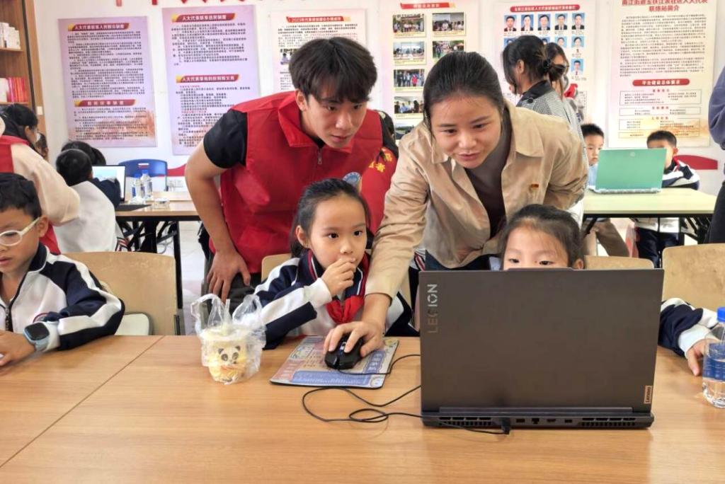 在进阶的“创意编程”环节,志愿者指导孩子们在电脑上操作编程工具,将硬件控制与软件编程相结合。从设计角色动作到调试程序逻辑,孩子们逐步完成了简易互动游戏的制作。“原来小猫在电脑上是这样动起来的!”一位小同学兴奋地说道。